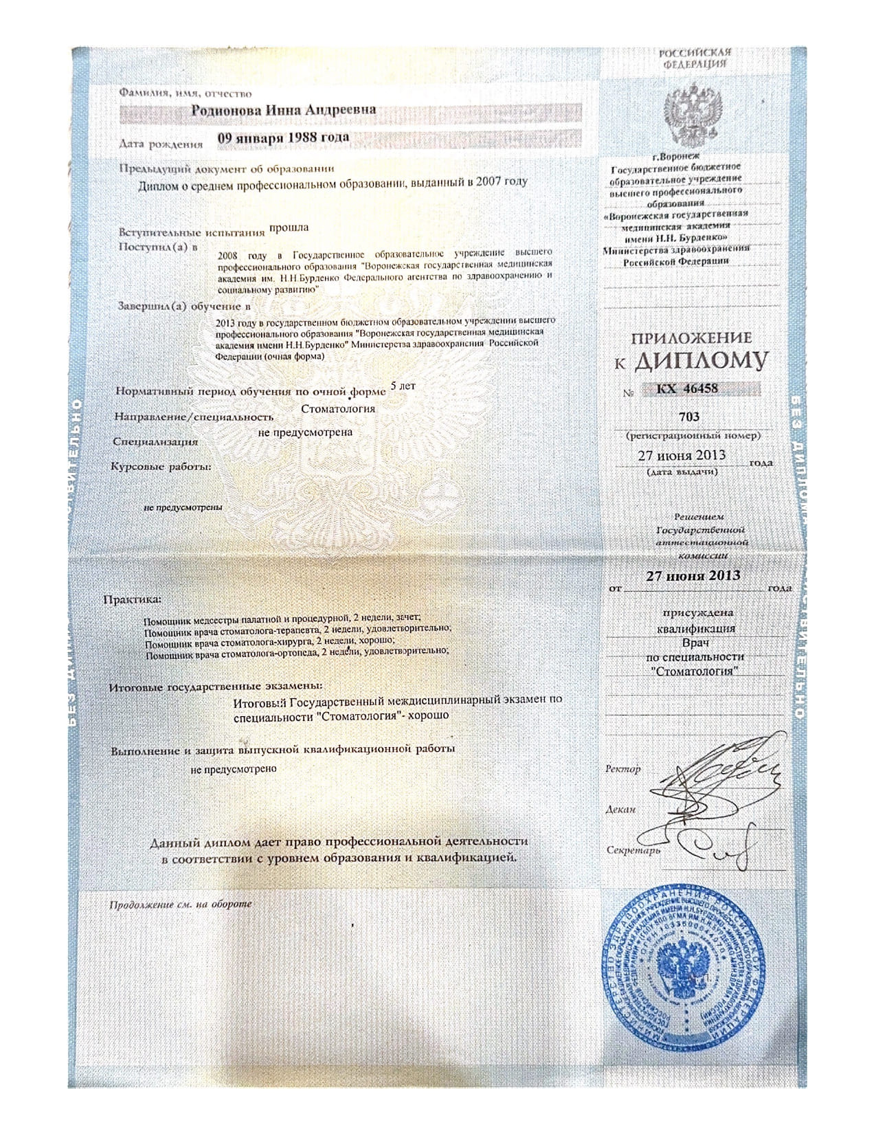ЗаписатьсяМеня зовут Инна Андреевна и я – стоматолог-терапевт с 9 летним опытом. Мой подход к лечению зубов основан на заботе о каждом пациенте, иновационных методах и индивидуальном подходе. Я верю, что улыбка – это не только признак здоровья, но и отражение вашей личности.